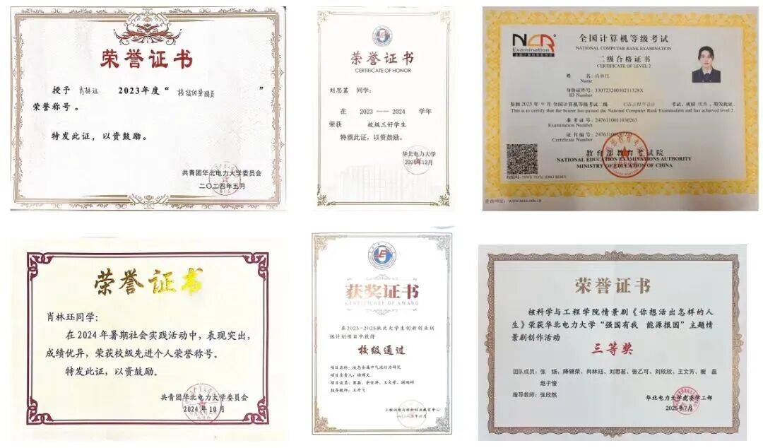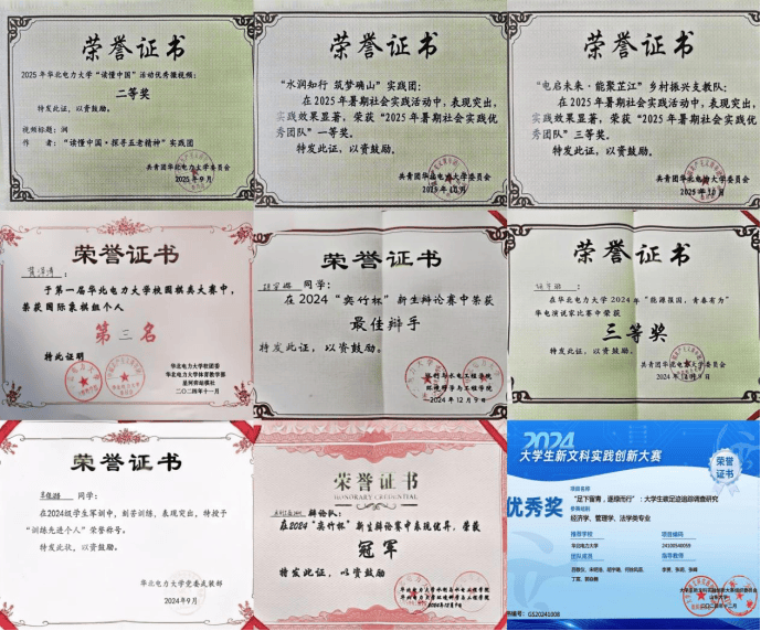 队伍与文化凝聚集体力量。15名班委组成坚强组织核心,66.7%的班委获一等奖学金,获评优秀团干部或团员4人次;文体活动中,获校级心理情景剧三等奖、乒乓球和谐杯团体第五名、院级羽毛球赛混双亚军等荣誉;社会实践践行责任使命。参与社会实践5人次,获首都高校乡村振兴服务优秀奖2人次,获校级优秀社会实践3人次,1人负责九三阅兵华电合唱学子出征纪实工作,全年志愿服务时长累计398.5小时,服务他人、奉献社会,研控计2437班用行动诠释华电学子的担当。