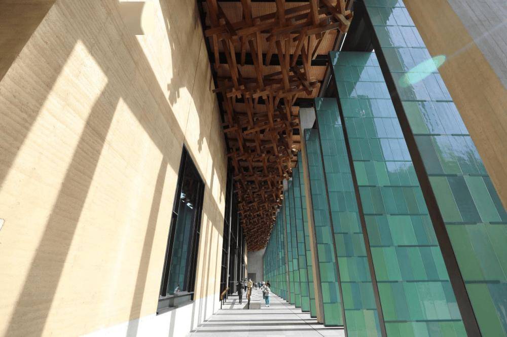 杭州国家版本馆的夯土墙技术,是王澍团队和联合国教科文组织在法国的生土研究所深度合作研发,用现代机械做的纯生态的新型材质,成分只有土、沙子和水,寿命可达上千年,为了得到这一技术,王澍曾3次飞往法国拜访调研。