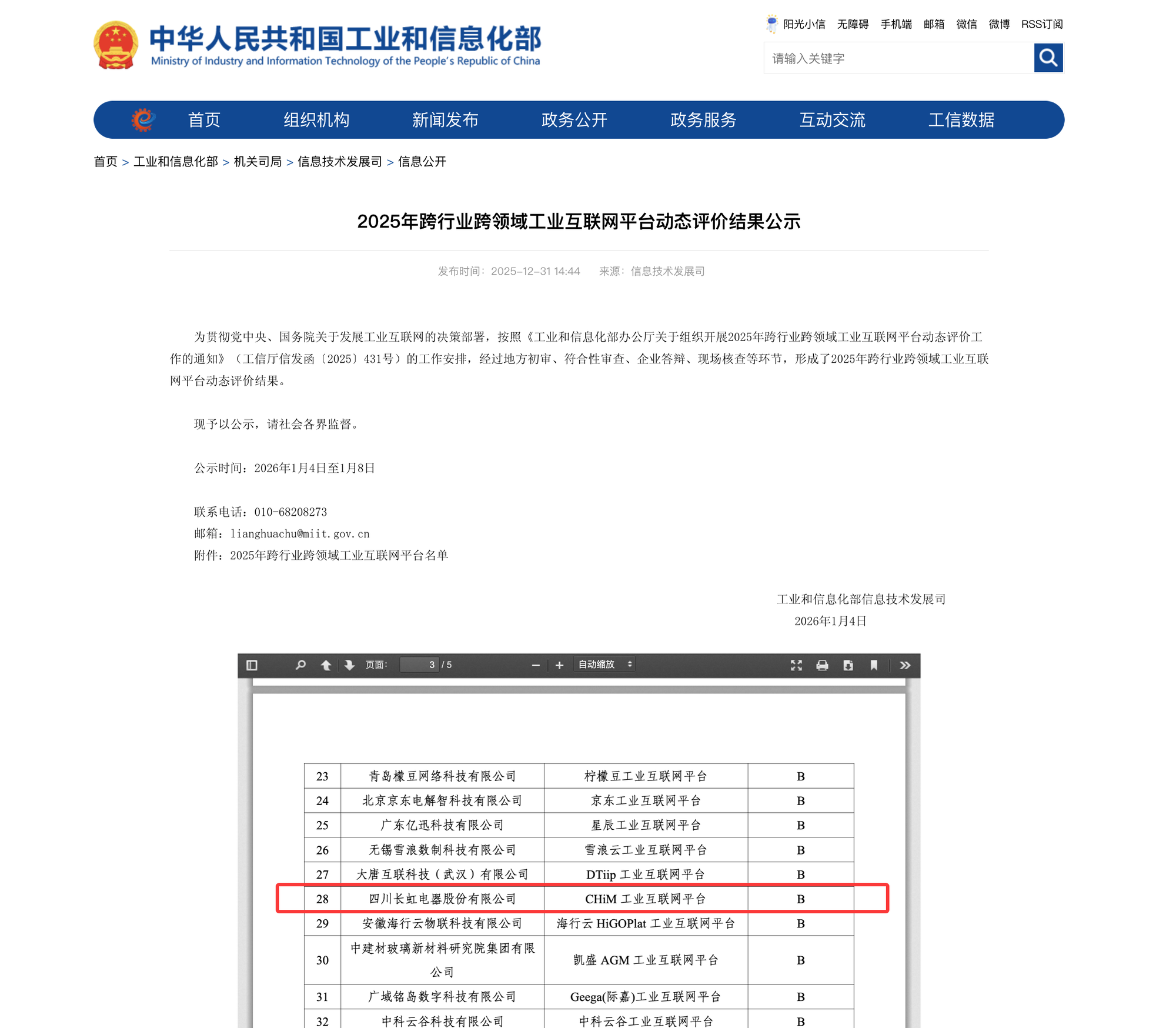 点击次数: AC米兰·(中文)官方网站-Milan brand2026年1月4日,工业和信息化部2025年跨行业跨领域工业互联网平台动态评价结果正式公示,长虹工业互联网双跨平台(以下简称“长虹双跨平台”)排名再次提升6位,上升幅度居全国第三、西部第一,自2023年入选国家级“双跨”平台以来累计跃升17位,创下四川省工业互联网在该领域的历史最高排位。这一成绩不仅巩固了绵阳在省内工业互联网平台的领先地位,更以“科技城速度”彰显了绵阳作为四川制造业数字化转型核心引擎的强劲势能,加速构建“智改数转”核心基础设施,为全省建设制造强省、数字强省树立了标杆。